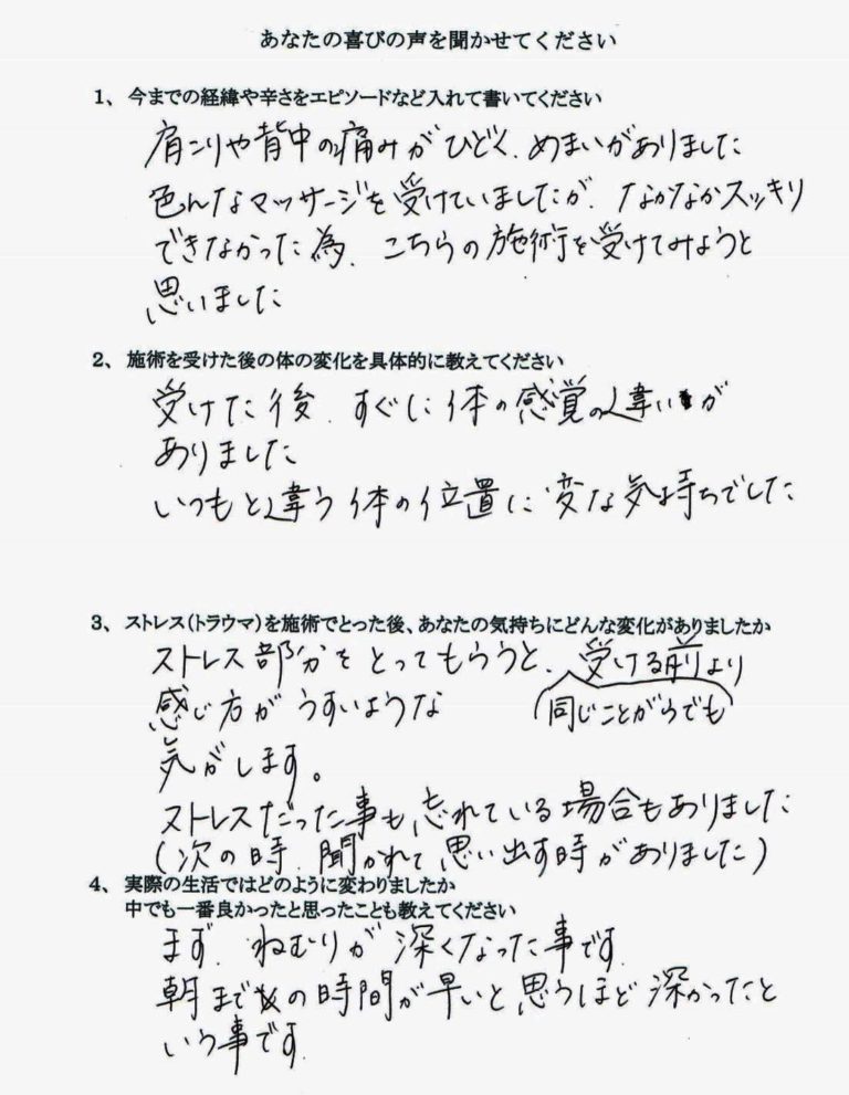 大阪市内からお越しの女性 首・背中の痛みと股関節に痛みでお困りでした